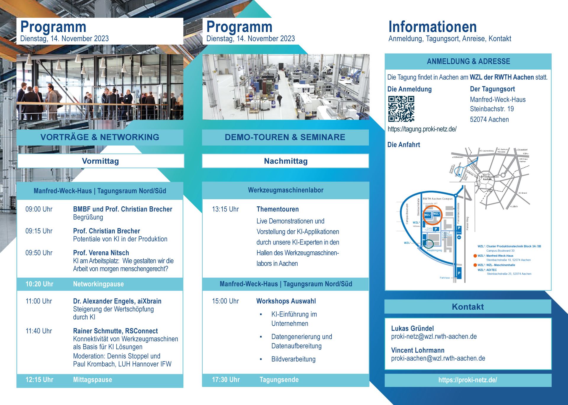 zeigen wir, das ProKI-Netz, am 14. November 2023 in einem hybriden Veranstaltungsformat mit Präsenzprogramm unter anderem in Aachen als auch digital, wie neue Technologien und Konzepte für eine intelligente Produktion aussehen können. Die Zentren des ProKI-Netzes bieten mit der Tagung 2023 ein Netzwerktreffen für alle KI-Enthusiasten oder die, die es noch werden wollen aus produzierender Industrie, Wirtschaft und Wissenschaft.